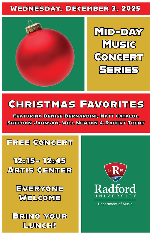 Radford University College of Visual & Performing Arts presents the free Midday Music Concert Finale featuring Christmas Favorites on Wednesday, December 3, 2025 at the Atrium inside the Artis Center for Adaptive Innovation and Creativity on the campus of Radford University.