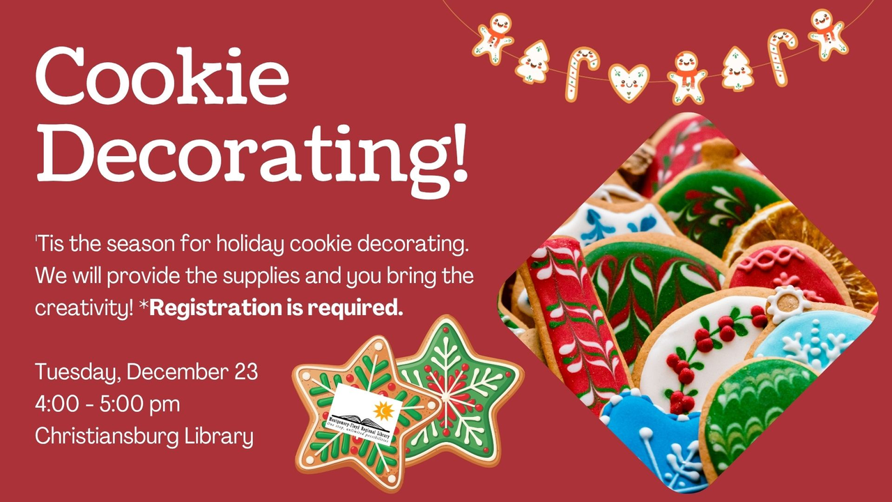 The Christiansburg Library presents a Cookie Decorating Party on Tuesday, December 23, 2025.