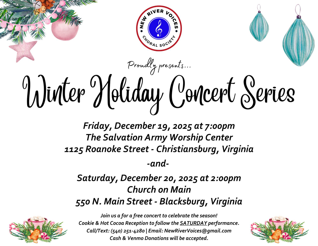 New River Voices Choral Society performs their Winter Holiday Concert on Saturday, December 20, 2025 at Church on Main in Blacksburg, VA.