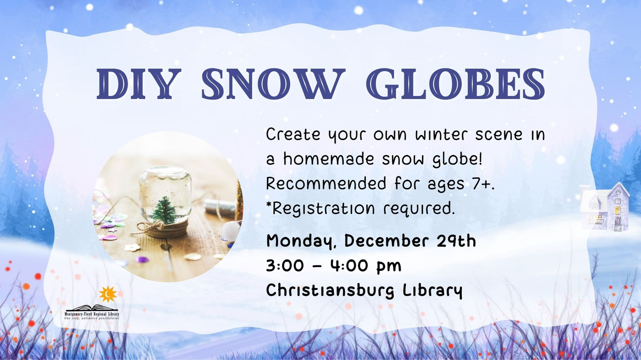The Christiansburg Library presents DIY Snow Globes on Monday, December 29, 2025.