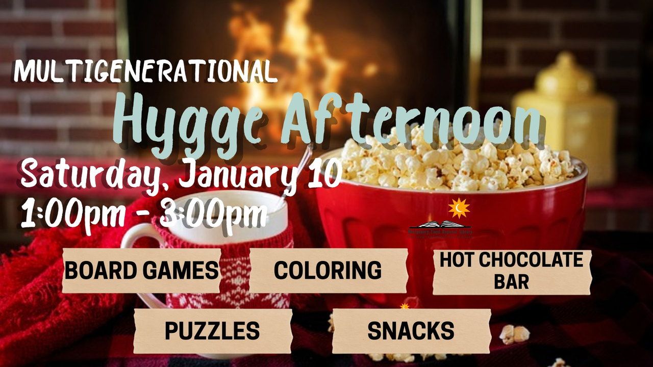 Join us for a hygge (pronounced hoo-gah) afternoon at the library! Hygge is the Danish practice of coziness and warmth and is perfect for the long, cold winter nights. We will have board games, coloring, puzzles, hot chocolate bar, snacks and of course, a cozy atmosphere.