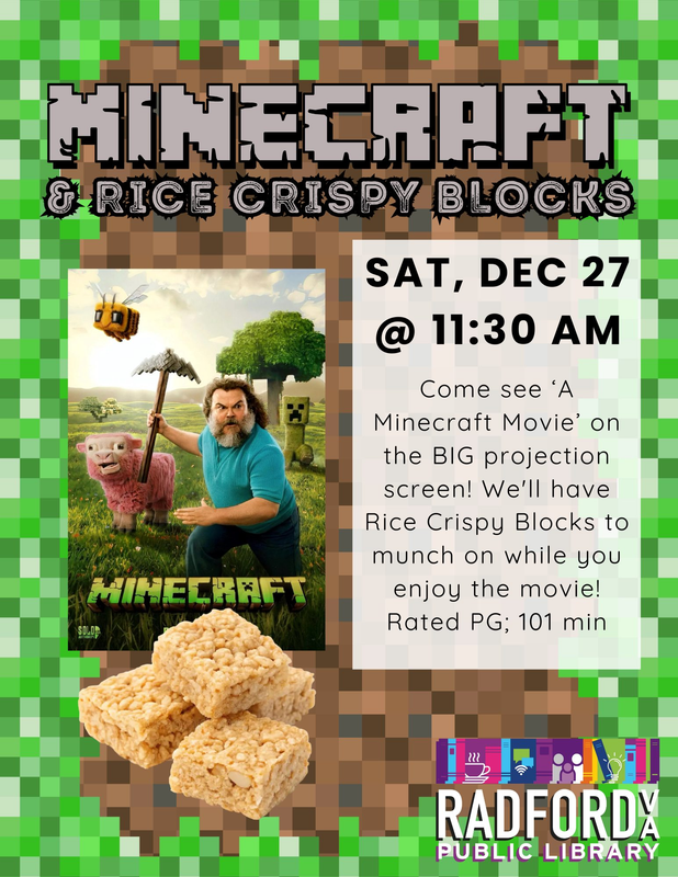 The Radford Public Library presents a Screening of "A Minecraft Movie" with Rice Crispy Blocks on Saturday, December 27, 2025.