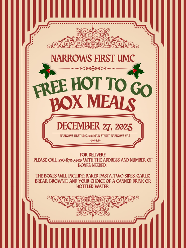 Narrows First United Methodist Church offers Free Hot To Go Box Meals on Saturday, December 27, 2025.