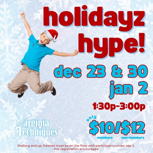 Virginia Techniques Training Center presents Holidayz Hype Open Gym for Kids on Friday, January 2, 2026.
