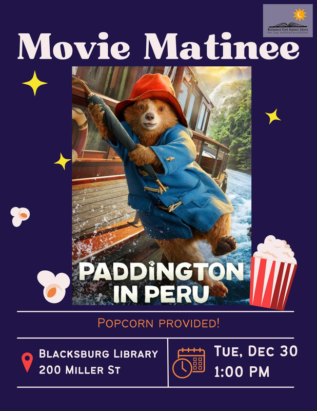 The Blacksburg Library presents Movie Matinee: Paddington in Peru on Tuesday, December 30, 2025.