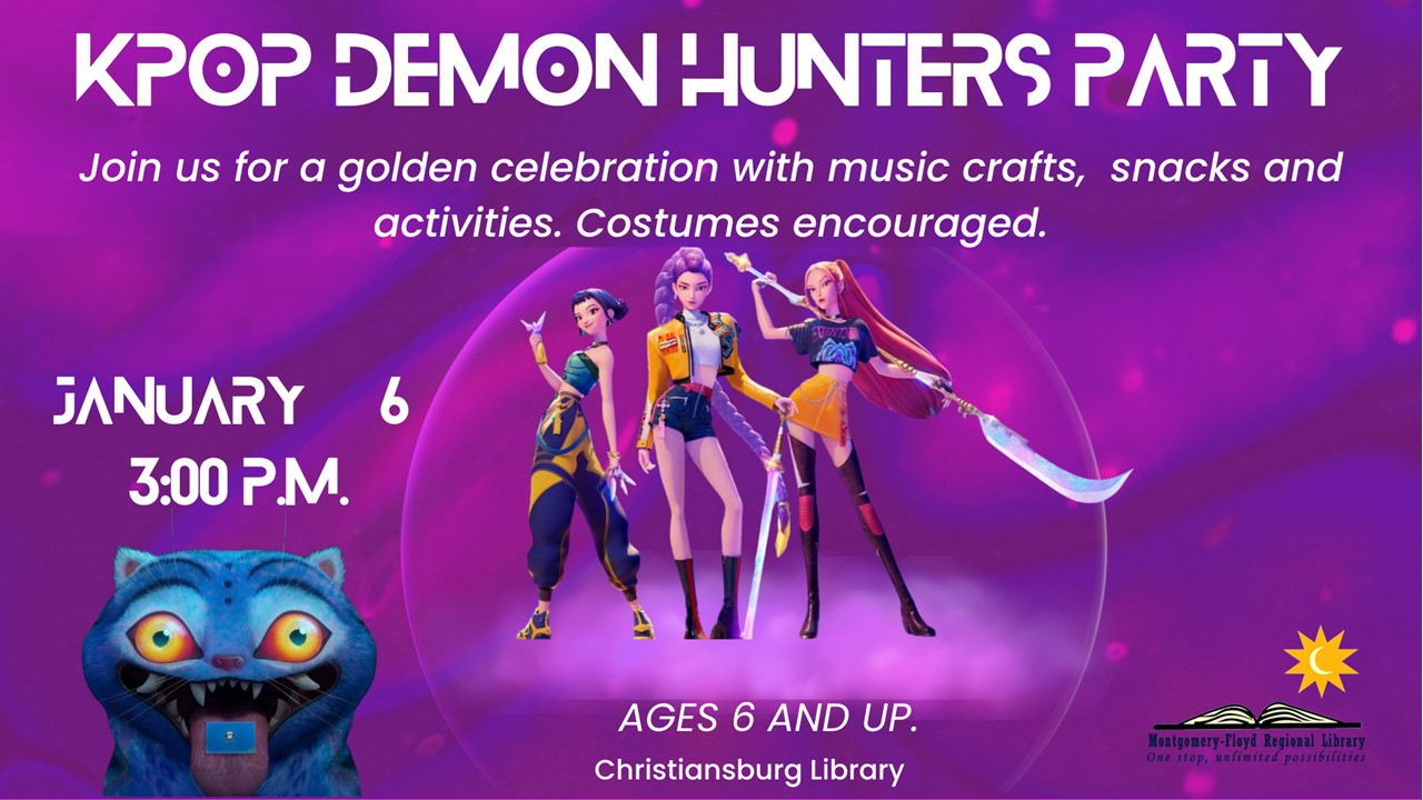 The Christiansburg Library presents a KPop Demon Hunters Party on Tuesday, January 6, 2026.