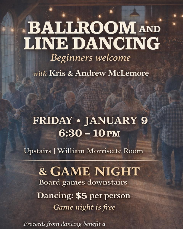 Chateau Morrisette presents their January Ballroom and Line Dancing Lessons and Game Night on Friday, January 9, 2025 in the William Morrisette Room.