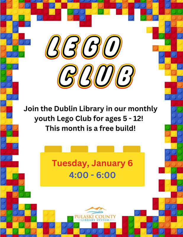 Join the Dublin Library in our monthly youth Lego Club for ages 5-12. This month is a free build, make whatever you want.
