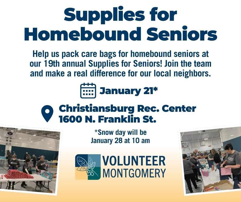 Volunteer Montgomery presents the 19th Annual Supplies for Seniors Bagging Day on Wednesday, January 21, 2026 at the Christiansburg Recreation Center.