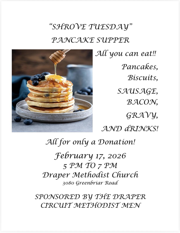 The Draper Methodist Church presents Shrove Tuesday Pancake Supper on Tuesday, February 17, 2026.