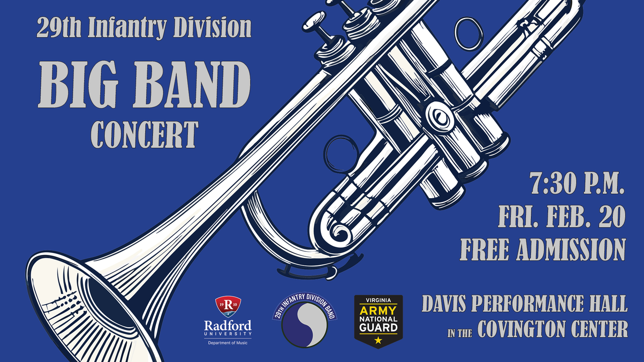 Radford University College of Visual & Performing Arts presents the 29th Infantry Division Virginia Army National Guard Big Band in concert on Friday, February 20, 2026 in Performance Hall located within the Covington Center on the campus of Radford University.