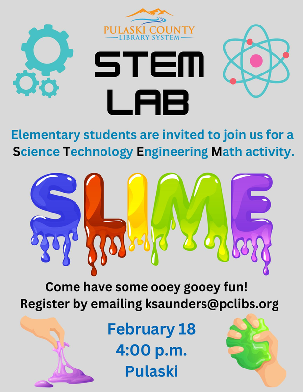 The Pulaski County Library continues their STEM Lab with the theme "Slime" on Wednesday, February 18, 2026.