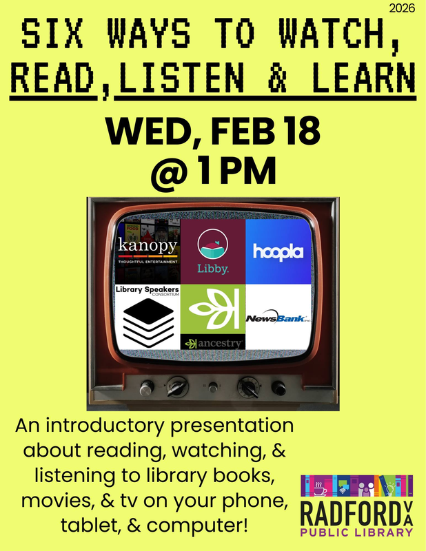 The Radford Public Library presents the program "Six Ways To Watch, Read, Listen & Learn" on Wednesday, February 18, 2026.