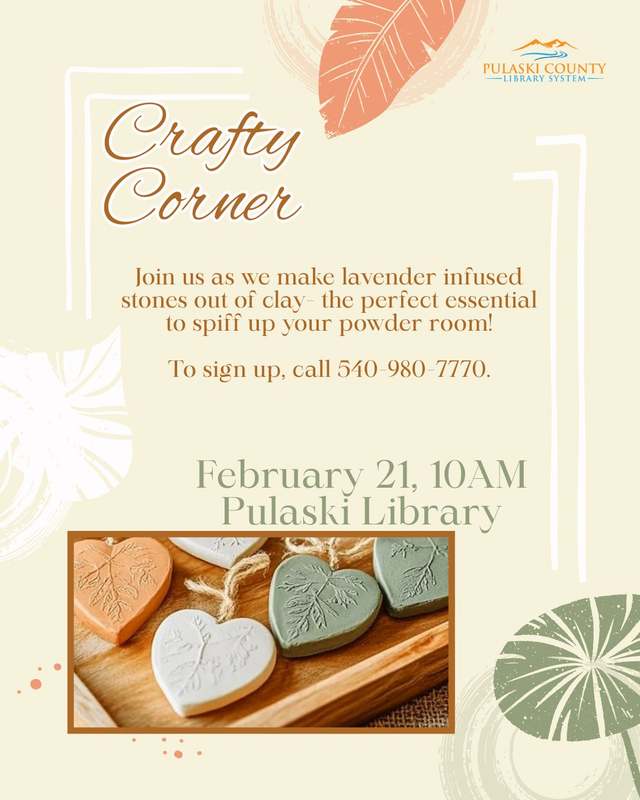 The Pulaski County Library continues The Crafty Corner series with "Lavender Infused Stones" on Saturday, February 21, 2026.