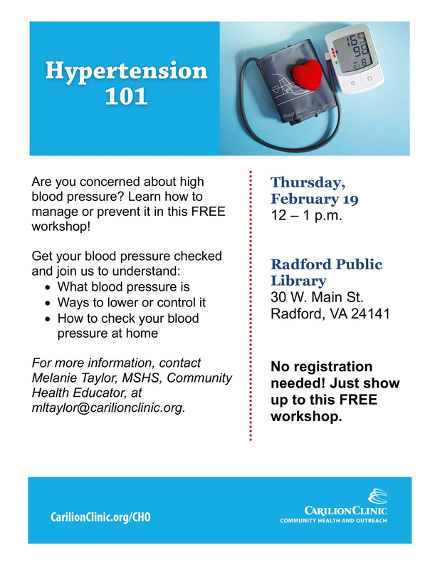 The Radford Public Library presents a Free Workshop titled "Hypertension 101" on Thursday, February 19, 2026.