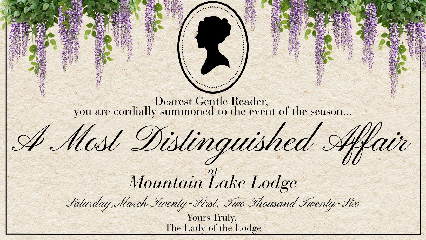 Mountain Lake Lodge presents A Distinguished Affair High Tea and Carriage Rides on Saturday, March 21, 2026 inside the Mountain Lake Lodge Grand Ballroom.