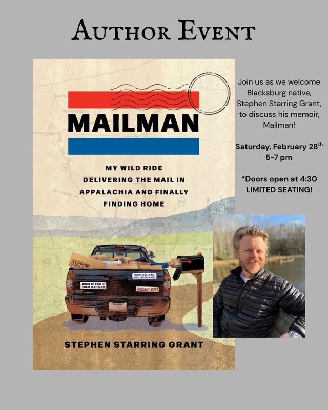 Join us as we welcome Blacksburg native Stephen Starring Grant to discuss his memoir "Mailman".