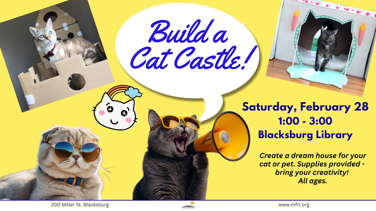 The Blacksburg Library presents the craft "Build a Cat Castle" on Saturday, February 28, 2026.
