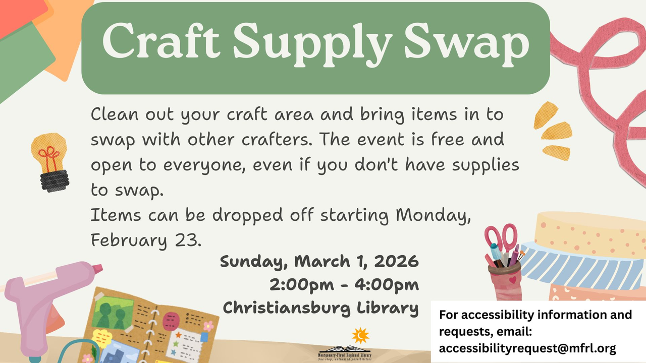 The Christiansburg Library presents a Craft Supply Swap on Sunday, March 1, 2026.