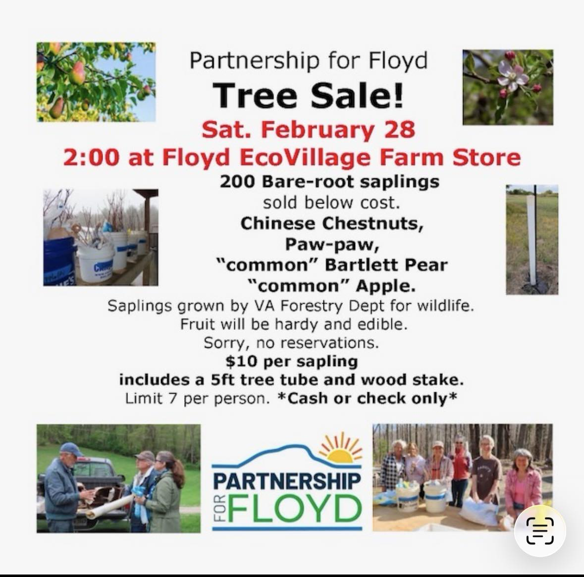 The Partnership for Floyd presents their Annual Tree Sale on Saturday, February 28, 2026 at the Floyd EcoVillage Farm Store.