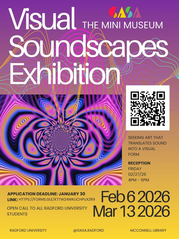 The Radford University College of Visual & Performing Arts presents the Art Reception for Visual Soundscapes Exhibition on Friday, February 27, 2026 in the Mini-Museum at the McConnell Library on the campus of Radford University.