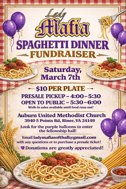 The Lady Mafia 12U Travel Softball Team presents a Spaghetti Dinner Fundraiser on Saturday, March 7, 2026 at Auburn United Methodist Church inside the Fellowship Hall.