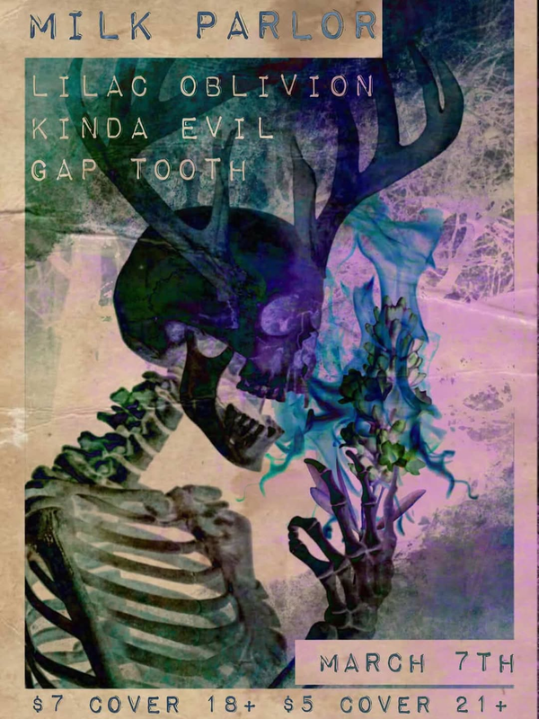The Milk Parlor presents Three Band Concert with Lilac Oblivion, Kinda Evil and Gap Tooth on Saturday, March 7, 2026.