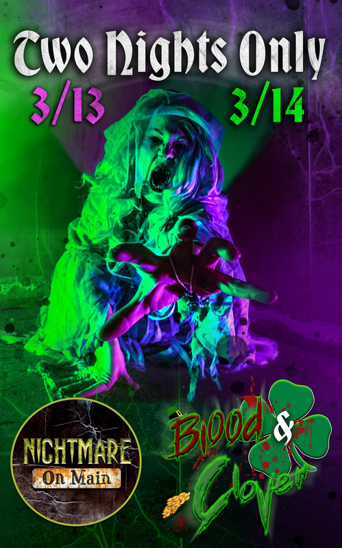Nightmare on Main presents their St. Patrick's Edition Haunted House titled Blood & Clover on Friday, March 13, 2026 and Saturday, March 14, 2026.