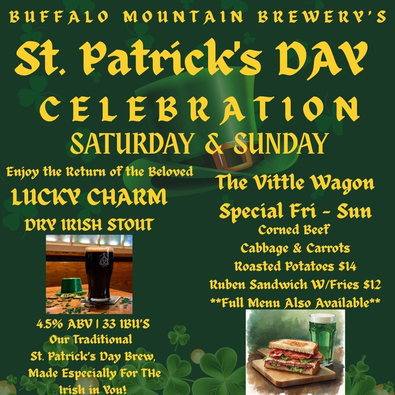 Enjoy the return of the beloved Lucky Charm Dry Irish Stout, Buffalo Mountain Brewery's traditional St. Patrick's Day brew made especially for the Irish in you.
