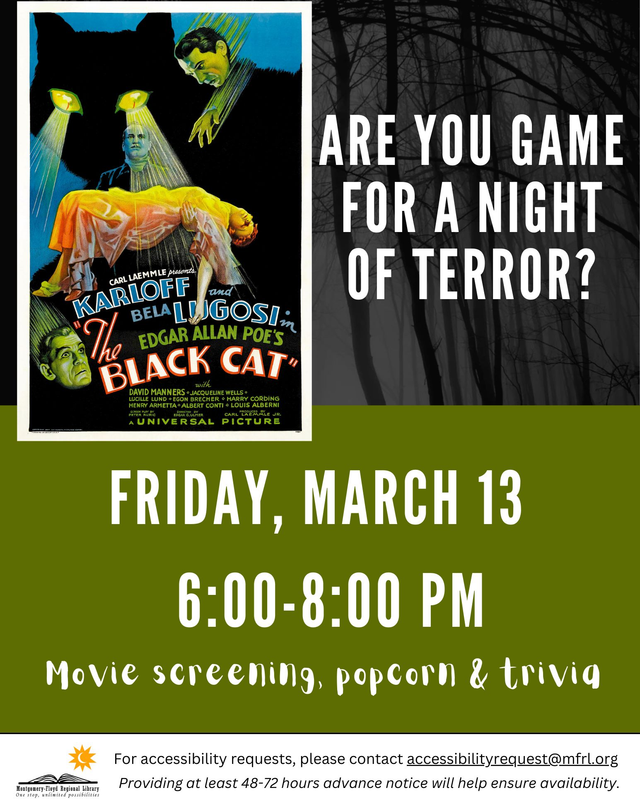 The Blacksburg Library presents the program "Terror at the Library: Horror Screening & Trivia Night" on Friday, March 13, 2026.