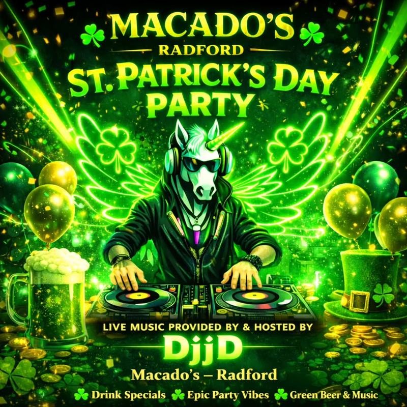 Macado's (Radford, VA) presents a St. Patrick's Day Party with DJ DjjD on Tuesday, March 17, 2026.