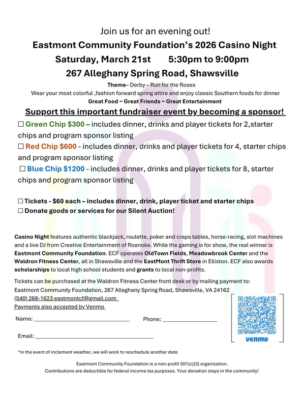 This is the Eastmont Community Foundation's largest fundraising event! Casino Night features authentic blackjack, roulette, poker and craps tables, horse-racing, slot machines and a live DJ from Creative Entertainment of Roanoke, VA. Dinner will feature classic southern foods. There will also be a silent auction featuring a wide variety of items including tickets to Larry the Cable Guy, Gary Allen and Ella Langley. Enjoy great food, great company and great entertainment!