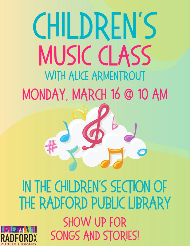The Radford Public Library presents March Children's Music Class on Monday, March 16, 2026.